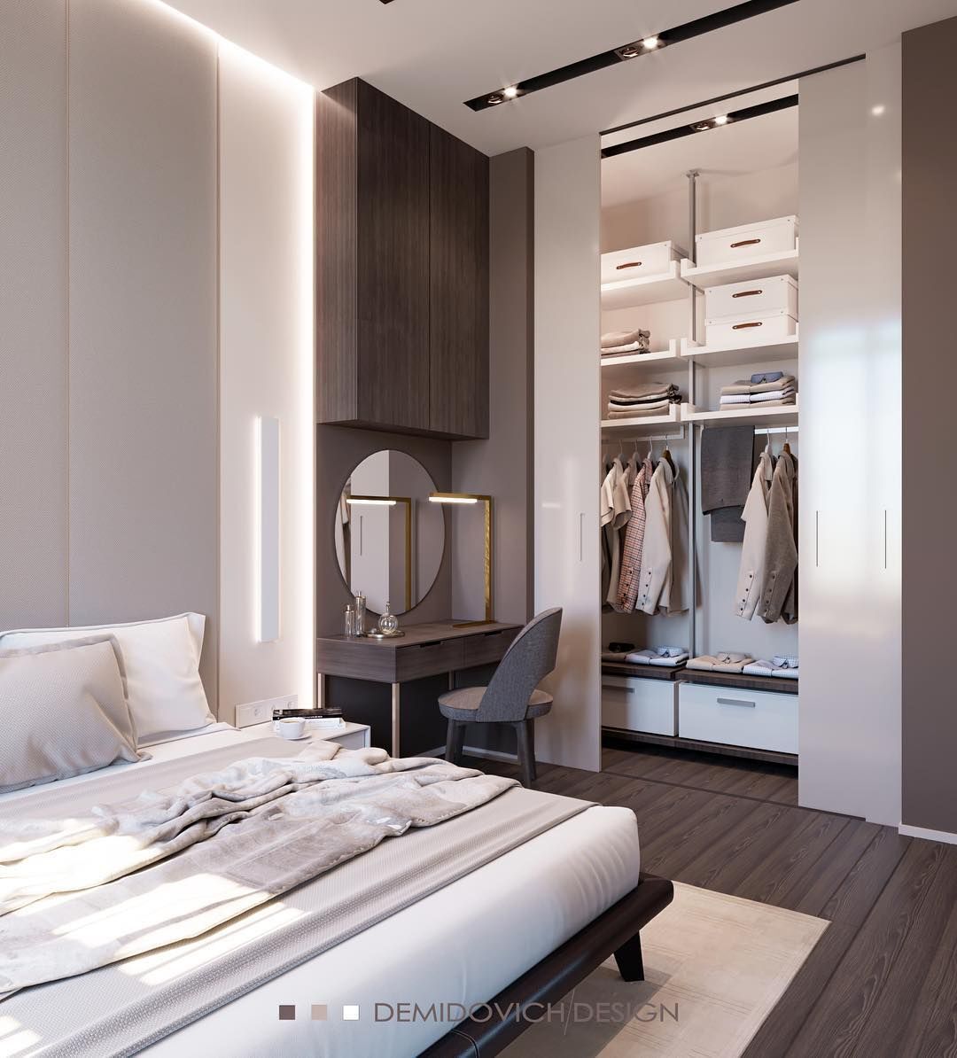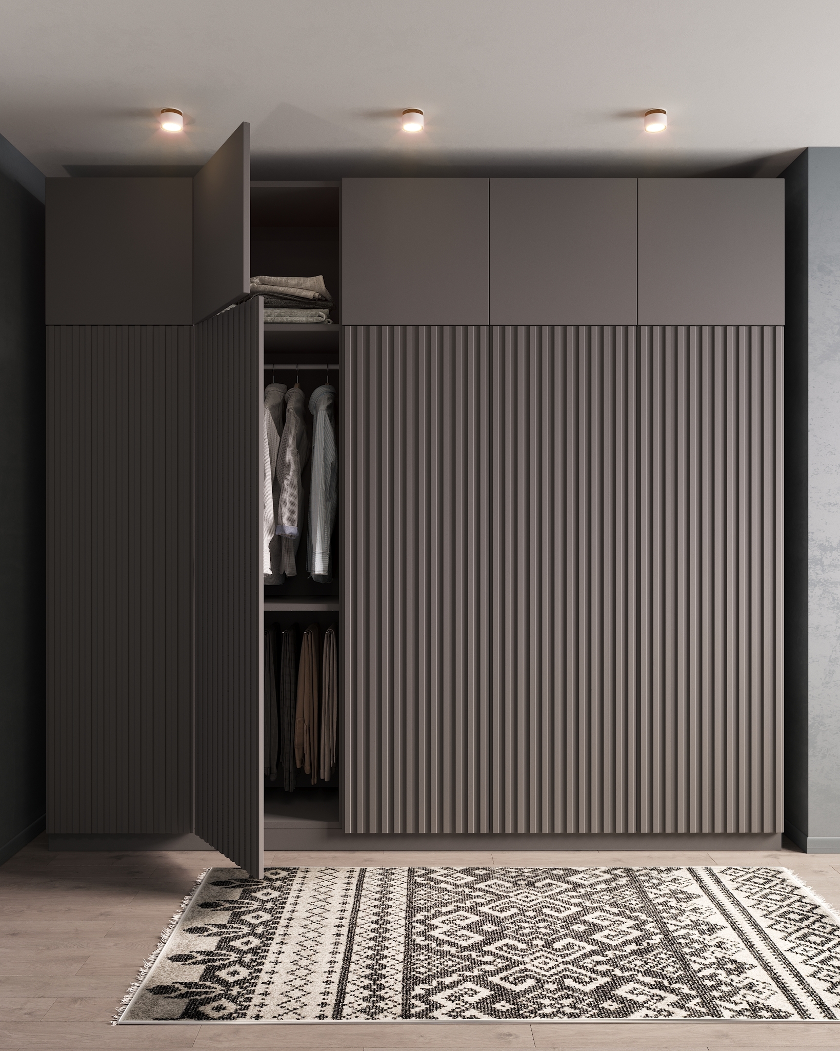Двери-невидимки выглядят как продолжение стен, скрывая гардеробную зону. Их делают распашными или раздвижными