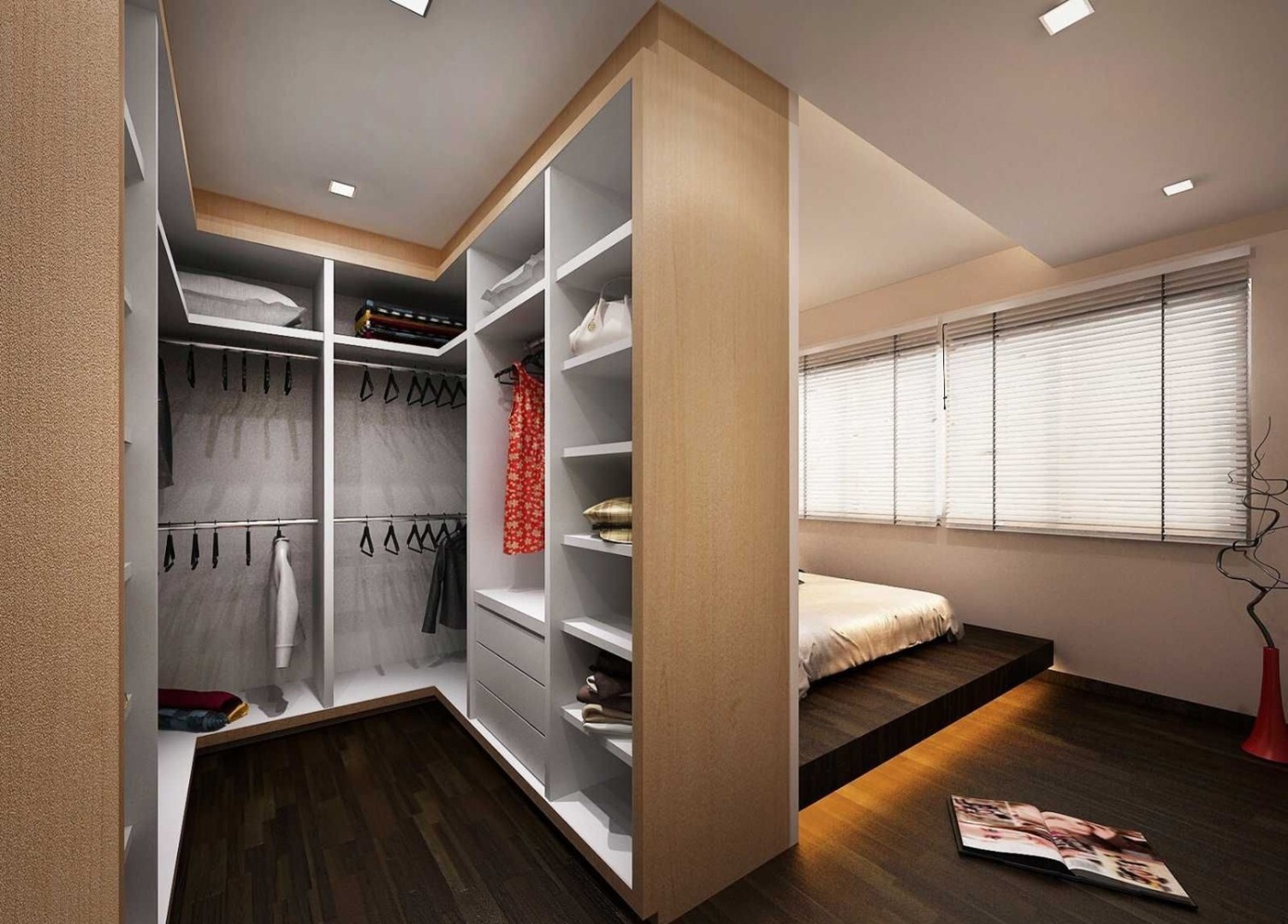 При свободной планировке гардеробная может играть роль зонирующей перегородки, совмещая функции хранения и разделения пространства.